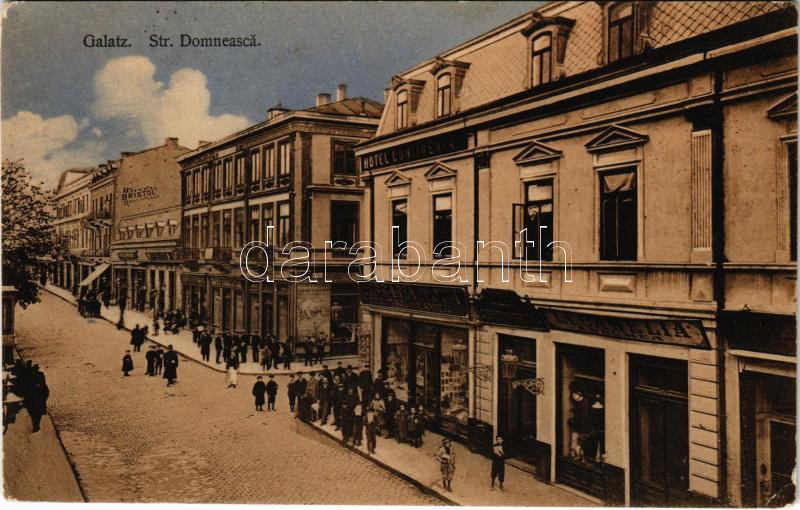 1910 Galati, Galatz; Str. Domneasca / street view, shops, Hotel Continental, Hotel & Restaurant Bristol, Libraria Nova, La Carmelia (S. Drumea) (EK)