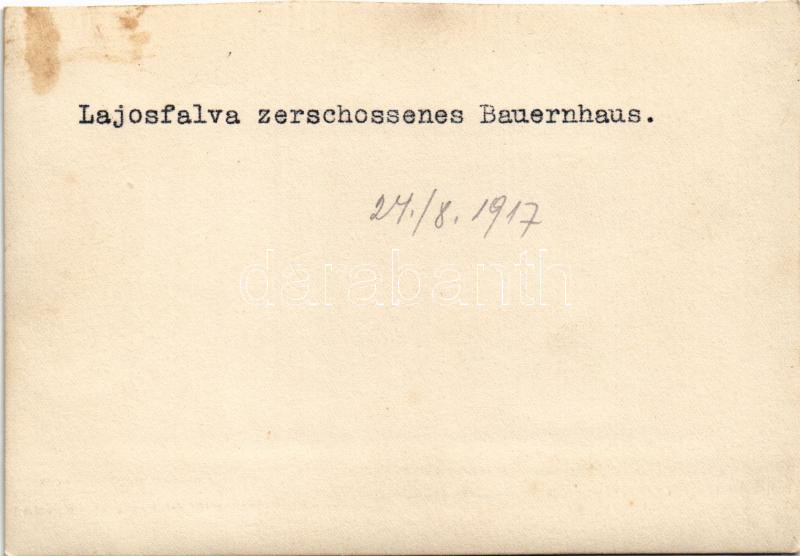 1917 Carlibaba, Kirlibaba, Radnalajosfalva (Bukovina, Bucovina); Lajosfalva zerschossenes Bauerhaus / WWI destroyes farm houses. photo (cut) (12,8 x 9 cm)