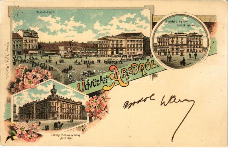 1899 (Vorläufer) Arad, Szabadság tér, színház épület délről nézve, Jószágkormányzóság palotája / square, theatre, Governing palace. Ottmar Zieher Art Nouveau, floral, litho