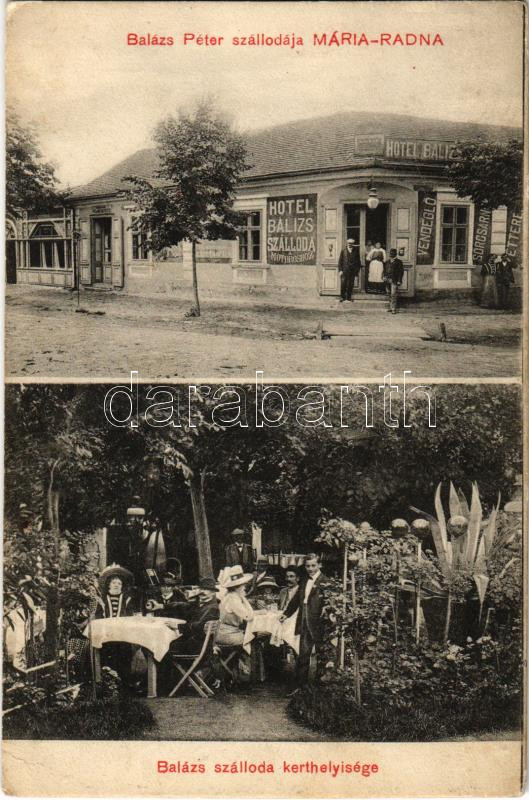 Description: 1915 Máriaradna, Radna (Lippa, Lipova); Balázs Péter szállodája a motoroshoz, vendéglő, sörcsarnok, kerthelyiség / hotel, garden and restaurant, beer hall (Rb)