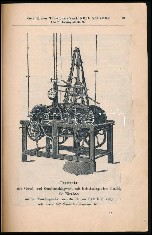 cca 1894-1900 Preis-Courant über Thurm-Uhren für Kirchen, Schlösser, Kasernen, Fabriken und Öffentlcihe Gebäude etc. Ersten Wiener Thurmuhrenfabrik von Emil Schauer. [Emil Schauer Első Bécsi Toronyóragyár Templomok, kastélyok, laktanyák, gyárak és középületek stb. toronyóráinak árjegyzéke.] Wien, é.n ,(Erste Wiener Vereins-Buchdruckerei-ny.), 60 p. Német nyelven. Gazdag képanyaggal illusztrált. Kiadói papírkötés, szakadt, kissé foltos borítóval, a borítón bejegyzéssel és bélyegzésekkel.