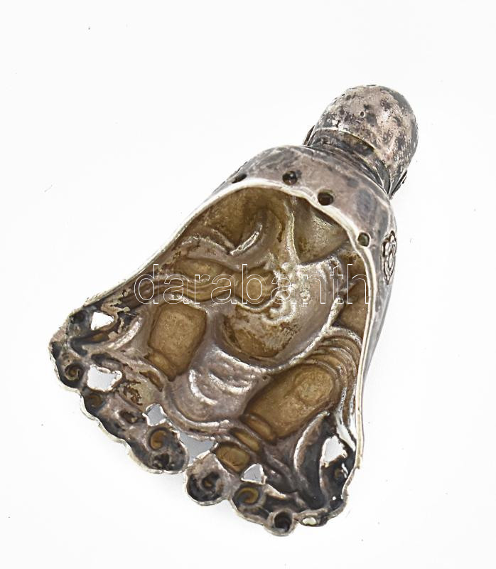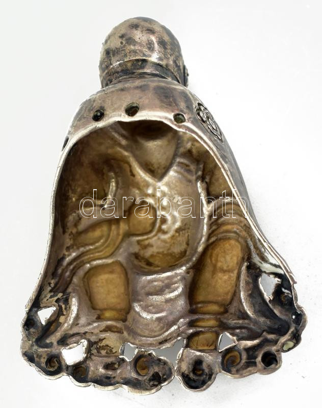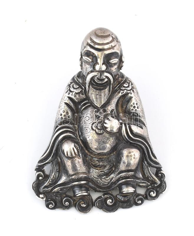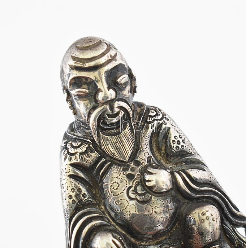 Antik ezüst (Ag) kínai ünnepi fiúsapka [Tiger hat] dísz. cca 19. sz. vége, jelzés nélkül, Shou Lao figurája, m: 5,5 cm, nettó: 18g /// A kínai hagyomány szerint a kínai fiúgyermekek az 5 éves korukra rendezett ünnepségen egy Tiger hat nevű sapkát kaptak, mely a rávarrt szimbólumokkal a gonosz erők elűzésére és az életerő, szerencse bevonzására volt hivatott. Egy ilyen sapka egyik dísze a jelen aukción szereplő Shou Lao figura.