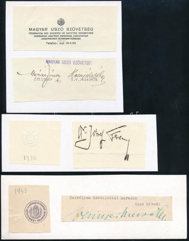 Description: Aláírás gyűjtemény kivágásokon: Komjádi Béla vízilabdázó, sportvezető, József főherceg, vitéz Balázs Dániel, Színyei Merje Jenő miniszter, Kogutowitz Károly földrajztudós
