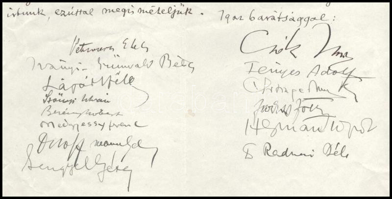 1939 Szinyei Merse Pál Társaság köszöntő levele Gerő Ödön (1863-1939) író, műkritikus, a Pester Lloyd munkatársa 75. születésnapja alkalmából, a magyar festészet, művészet- és kultúrtörténet számos kiemelkedő alakjának autográf aláírásával: Petrovics Elek, Iványi-Grünwald Béla, Lázár Béla, Szőnyi István, Berény Róbert, Medgyessy Ferenc, Lengyel Géza (1881-1967), Csók István, Fényes Adolf, Oltványi-Artinger Imre, Farkas Zoltán (1880-1969), Herman Lipót, Radnai Béla (1891-1962) és még egy beazonosítandó, össz. 14 aláírással. Szinyei Merse Pál Társaság fejléces papírján, hajtás mentén apró lapszéli szakadással.1930-ban Gerő Ödönt a Szinyei Merse Pál Társaság rendes tagjává választották, halálakor gyásztáviratot küldtek a családjának. Becses kultúrtörténeti ritkaság!