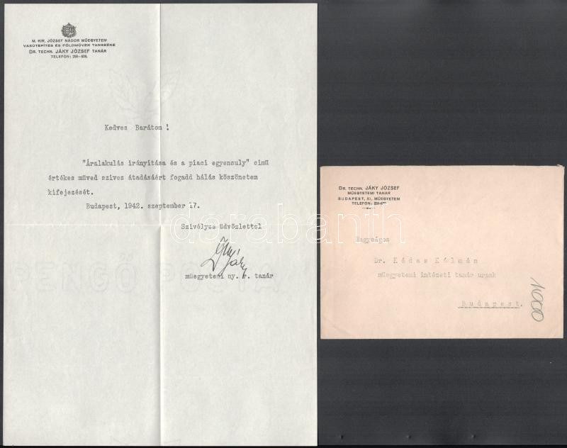 1942 Bp., Jáky József (1934-ig Janicsek) (1893-1950) közlekedésmérnök, talajmechanikus, egyetemi tanár, az MTA tagja, a M. Kir. József Nádor Műszaki és Gazdaságtudományi Egyetem (Műegyetem) vasútépítés és földművek tanszéke (később geotechnikai tanszék) vezetőjének gépelt köszönő levele Kádas Kálmán (1908-1985) gépészmérnök, közgazdász részére, Jáky József autográf aláírásával, vízjeles papíron, eredeti borítékkal