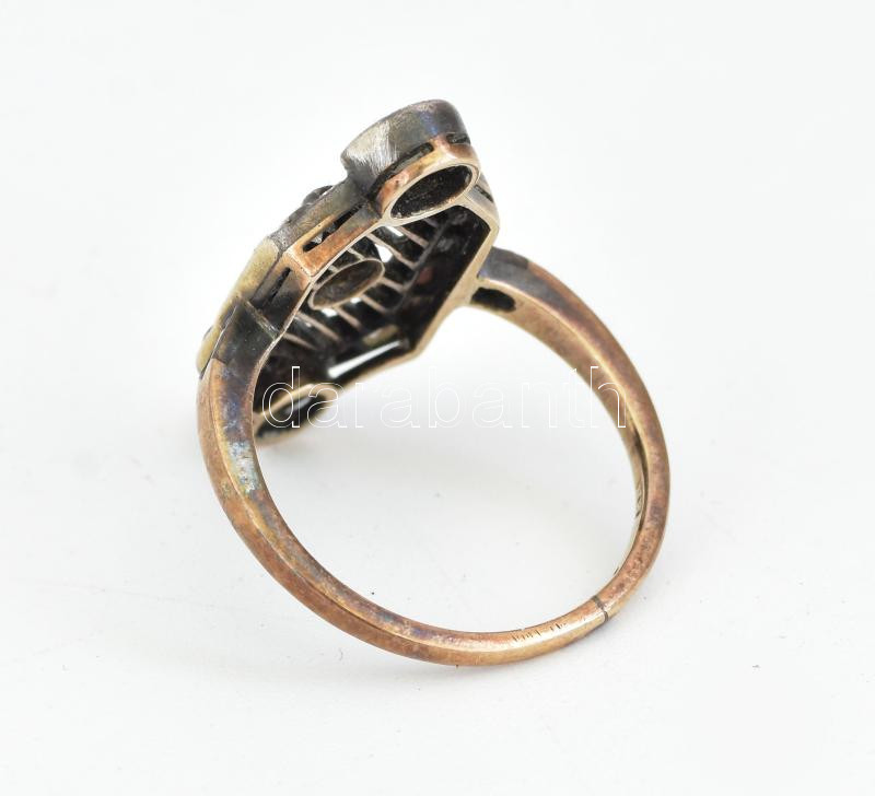 Arany (Au) 14K és ezüst (Ag) gyűrű 14 db 0,02 ct és 2 db 0,25 ct gyémánttal, hiányos rubin berakással, jelzett, méret: 52, bruttó: 3,6 g