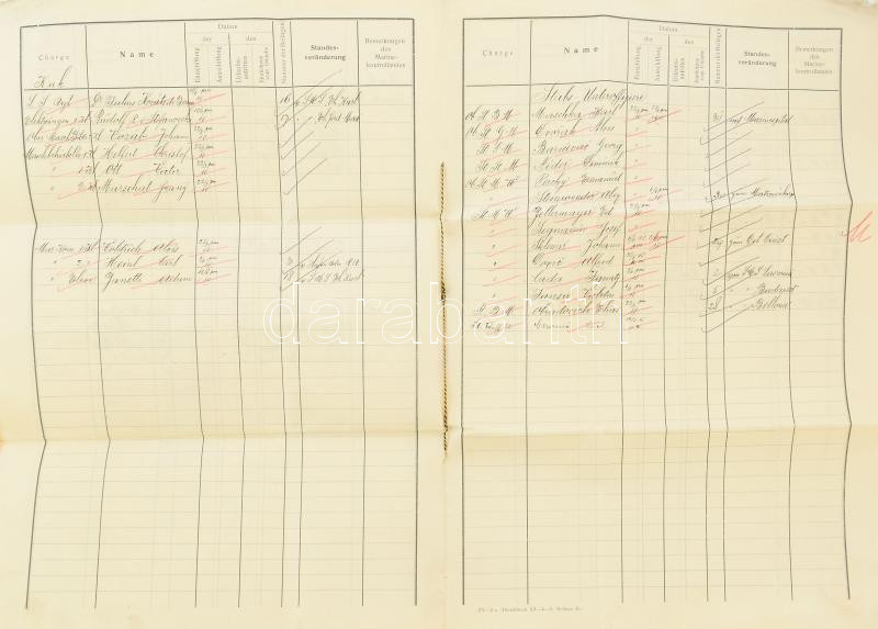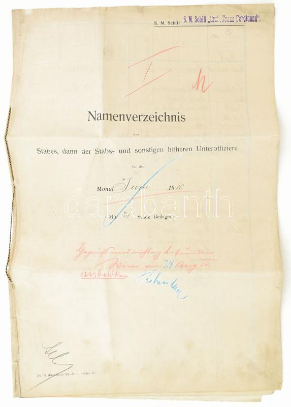 1911 Az S.M.S. Erzherzog Ferdinand osztrák-magyar hadihajó kimutatása a júniusban fedélzetre lépett magas rangú tisztekről. A parancsnok aláírásával és a hajó pecsétjével, részletezve a személyekkel / Namenverzeichnis for the month of June 1910, dated June 30, 1910. Six-page document, sewn to form a book, signed in Pola by the officer in command on September 30, 1910. Seal: S.M. Schiff ,,Erzh. Franz Ferdinand". Kalis/Kohl No. 2 [type DL 1a] violet Page two lists the following officers who were serving on or boarded S.M.S. Erzherzog Franz Ferdinand during the month: Kontreadmiral Anton Haus Linienschiffskapitän Rudolf Graf von Benigni in Müldenberg (born in 1862; gazetted Linienschiffskapitän on December 1, 1908) Korvettenkapitän Franz Lauffer (not found in the 1909 Rangliste) Linienschiffleutnant Hermann Ritter von Jedina (born in 1881, gazetted Linienschiffsleutnant on January 1, 1900) Fregattenleutnant Johann Kainer (born in 1880, gazetted Fregattenleutnant on November 1, 1905; Linienschiffsleutnant on November 1, 1910) Seefähnrich Maximilian Libano (gazetted Seekadet on July 1, 1907; not found in the 1917 Rangliste) Seekadet Otto Janota (not found in the 1909 or 1917 Rangliste) Linienschiffsarzt Dr. Leopold Majdić (born in 1870, gazetted Linienschiffsarzt on May 1, 1901; Marine-Oberstabsarzt 2. Klasse on November 1, 1916) The list continues on page three: Fregattenleutnant Marko Gregor (born in 1881, gazetted Fregattenleutnant on May 1, 1906; Linienschissleutnant on November 1, 1910; prisoner of war) Fregattenleutnant Wenzel Wosečk (born in 1882, gazetted Fregattenleutnant on May 1, 1907; Linienschiffsleutnant on November 1, 1911) Fregattenleutnant Josef Holub (born in 1885, gazetted Fregattenleutnant on May 1, 1908; Linienschiffsleutnant on November 1, 1912; future commanding officer of S.M. U-22, S.M. U-23, and S.M. U-27). Fregattenleutnant Heinrich Pfeiffer (born in 1886, gazetted Fregattenleutnant on May 1, 1908; Linienschiffsleutnant on November 1, 1912) Fregattenleutnant Johann Wildner (born in 1885, gazetted Seefähnrich on July 1, 1907; Linienschiffsleutnant on January 1, 1914) Seefähnrich Karl Poeckh Ritter von Heldenwald (born in 1888, gazetted Seekadet on July 1, 1907; Linienschiffsleutnant on November 1, 1914) Seekadet Hugo Pistel (born in 1890, gazetted Linienschiffsleutnant on May 1, 1916, future commanding officer of S.M. U-11 and S.M. U-18) Seekadet Eugen Duimich (born in 1889, gazetted Fregattenleutnant on May 1, 1907; Linienschifsleutnant on May 1, 1916) Seekadet Karl Augustin (born in 1890, gazetted Fregattenleutnant on May 1, 1913; prisoner of war) Seekadet Oswald Ritter Salvini von Meeresburg-Plawen (born in 1890, gazetted Fregattenleutnant on May 1, 1907; Linienschifsleutnant on May 1, 1916) And on page four: Linienschiffsarzt Dr. Julius Kováts de Berencs (gazetted Linienschiffarzt on May 1, 1908; not found in the 1917 Rangliste)