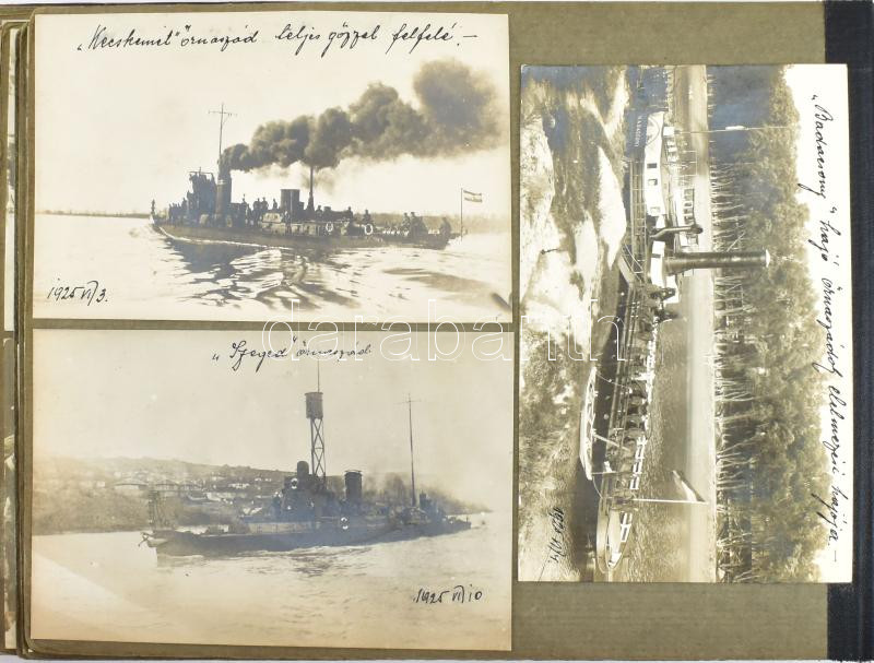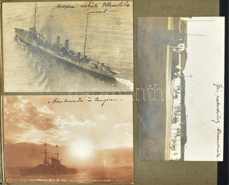 1914-1918 I. világháborús haditengerész és Dunai Flottilla katona fotóalbuma, 112 db rendkívül érdekes feliratozott fényképpel: Szent István csatahajó a Novara, valamint az osztrák-magyar haditengerészet nagyon sok hajójáról készült nevesített izgalmas fotók, olasz városok lövetése, a kikötőben és harc közepette, valamint a legénység élete képekben. valamint számos dunai hajó nevesítve. IV. Károlyról, Horthy Miklósról készült eredeti fotók. Érintetlen anyag, szép bőr albumban. / 1914-1918 World War I sailor and Danube Flotilla soldier's photo album, with 112 extremely interesting captioned photos: Szent István battleship Novara, as well as famous exciting photos of many ships of the Austro-Hungarian navy, shelling of Italian cities, in the harbor and in the midst of battle, and the life of the crew in pictures. as well as numerous Danube ships named. . Original photos of Károly and Mikós Horthy. Pristine material, beautiful leather in album.
