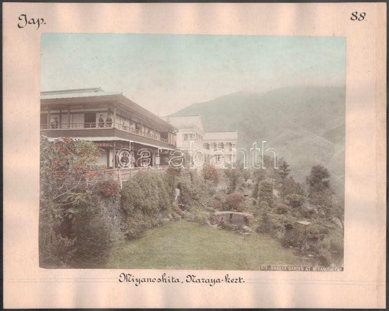 circa 1890 Japanese Kusakabe Kinbei (1841-1932), photos Tokyo Horikiri Mukojima / Miyanoshita, Naraya garden. Double sided cardboard hand-colored albumen photos inscibed by Hungarian traveller 33x26 cm