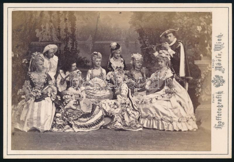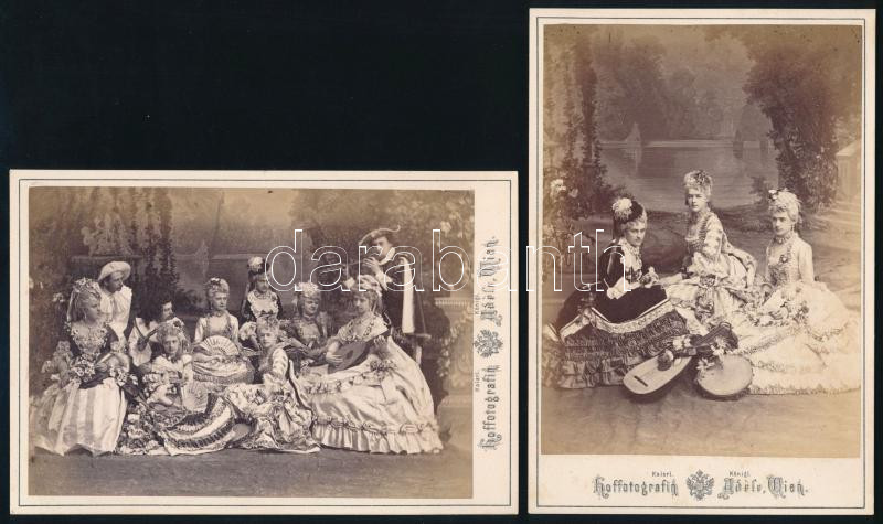 cca 1870-1875 Bécs, ismeretlen színtársulat tagjai barokk jelmezekben, hangszerekkel, színpadi díszlet előtt. 2 db kabinetfotó Adéle cs. kir. udvari fényképész bécsi műterméből, jó állapotban, 11x16,5 cm // cca 1870-1875 Vienna (Wien), unidentified theatrical troupe, actors dressed in baroque costumes, with musical instruments, in front of a stage set. Cabinet cards from the studio of Adele in Vienna, 2 pcs, in good condition, 11x16.5 cm