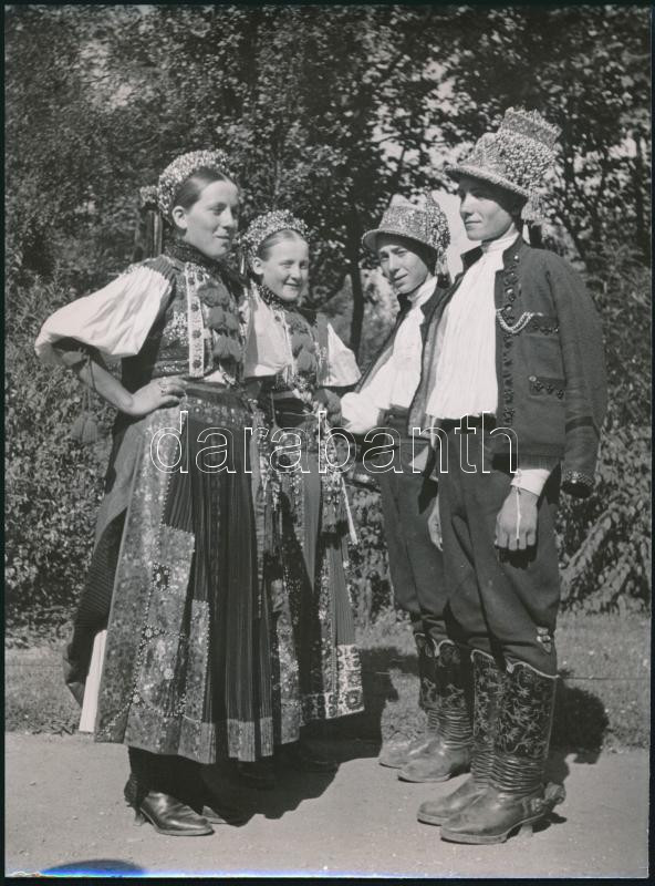 cca 1930-1940 Szendrő István (1908-2000): Fiatalok inaktelki (Erdély) viseletben, Gyögyösbokréta mozgalom, hátoldalon pecséttel jelzett fotó, 23×17 cm