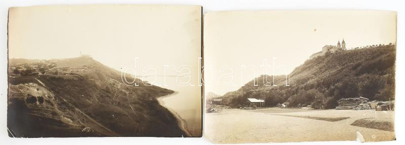 Description: cca 1920-1930 Tihany látképe és Tihany Balaton-part fotója, az utóbbin felül az apátsággal, lent hátul vendéglő - étterem - bazár épületekkel, 2 db fotó, szakadtak, 12x17 cmx2