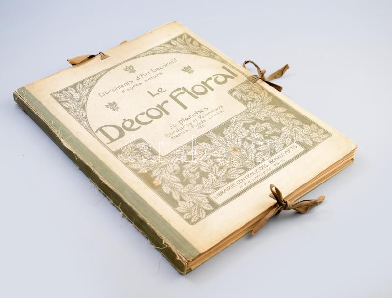 cca 1910 Documents d'Art Decoratif d'apres nature Le Decor Floral. 50 planches. Bordures et Panneaux, Semis, Fonds ornés, etc. Paris, én., Libraire Centrale Des Beaux-Art, 1 (díszcímlap) +50 (képtáblák) t. Kollotípiák, jelzés nélkül. Virágmintás ornamentikával díszített, rendkívül ízléses és dekoratív szecessziós képtáblák, néhol már felfedezhető Art Deco motívumokkal is. Kiadói illusztrált félvászon-kötés, kopott, kissé foltos borítóval, kissé sérült gerinccel, egy lapon apró folt, egy másik szélén apró sérülés, de a mappa alapvetően jó állapotú és teljes. Rendkívül ritka!