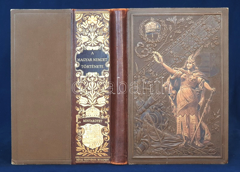 A magyar nemzet története. Szerkeszti: Szilágyi Sándor. Ügynöki mintakötet. Budapest, 1895. Athenaeum Irodalmi és Nyomdai Rt. 1 t. (hártyapapírral védett címkép, színes kőnyomat) + 15 + [1] p.; 161-176 p.; CLXXII-CXCII p.; XVI p.; CXLV-CLX p.; 17-32 p.; XXXIII-XLVIII p.; 195-206 + [2] p. + 7 t. (színes litográfia, ebből 4 dupla oldalas) + 3 t. (heliogravűr, ebből egy dupla oldalas) + 32 t. (ebből 6 dupla oldalas) + 3 térkép (színes, dupla oldalas) + 2 melléklet (dupla oldalas, ebből egy színes). Az 1896. évi ezredéves ünnepségsorozat méltó megünneplésére a könyves szakma is készült. Emich Gusztáv vezérigazgató kezdeményezésére az Athenaeum Irodalmi és Nyomdai Rt. reprezentatív, gazdagon illusztrált történelmi sorozatot indított. A közületek, hazafiak és családok részére szánt, olvasmányos stílusban készült, népszerű, tíz kötetes munka szerkesztésével Szilágyi Sándor történészt bízták meg. A kihajtható táblákkal és hasonmásokkal, színes kőnyomatokkal, heliogravűrökkel és egyszínnyomású táblákkal, színes térképekkel gazdagon mellékelt népszerű történelmi szakmunkát oldalszámozáson belül további gazdag szövegközti illusztrációs anyag kísérte, mely grafikákat a korszak vezető könyvillusztrátorai jegyzik: Benczúr Gyula, Cserna Károly, Déry Béla, Dörre Tivadar, Malachovsky Nándor, Mühlbeck Károly, Passuth Ödön, Richter Aurél, Spányi Béla, Székely Árpád. Ügynöki mintapéldányunk a reménybeli előfizetők meggyőzésére készült, és a nagy munka összesen nyolc részletét hordozza, gazdag tábla- és térképmelléklet kíséretében. Címképén Munkácsy Mihály "Honfoglalás" című történelmi festményének egyik vázlata "A szlávok hódolata Árpád előtt" címmel, színes kőnyomatú kivitelben, hártyapapírral védve. Díszesen aranyozott, dombornyomásos illusztrált kiadói félbőr kötésben, a hátsó kötéstáblán aranyozott ornamentikus minta és az aranyozott nagycímer kíséretében elhelyezett aranyozott címfelirattal, márványmintás festésű lapszélekkel, enyhén kopott kiadói védőborítóban. Dekoratív, szép példány.