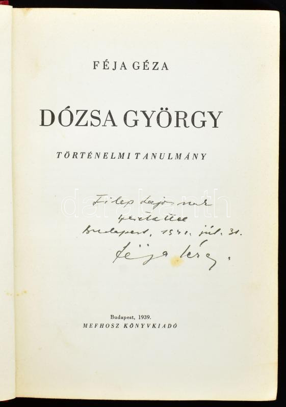 Féja Gézas: Dózsa György. Történelmi tanulmány. A szerző, Féja Géza (1900-1978) író, újságíró, szerkesztő által Filep Lajos (1895-1967) főmérnök részére DEDIKÁLT példány. "Filep Lajosnak szeretettel Budapest 1942 júl. 31. Féja Géza." Bp., 1939, MEFHOSZ, (Kir. M. Egyetemi Nyomda),243+10 p. Kiadói aranyozott egészvászon-kötés, kopott, foltos borítóval, kissé sérült gerinccel, laza fűzésserl.