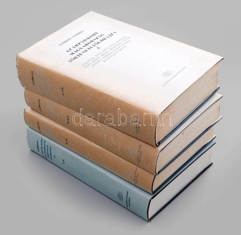 Györffy György (1917-2000) történész, középkorász monumentális munkája levéltári adatok segítségével rekonstruálja Magyarország Árpád-kori megyéinek teljes településföldrajzát. Az oldalszámozáson belül számos megye-, vár- és várostérképpel illusztrált kötetek alfabetikus sorrendben sorakoztatják az ország Árpád-kori megyéit, általános jellemzését adják a megyék kialakulásának, térképes formában adatolják a megye területének nagyobb nemzetségi és egyházi birtokosait. A megyei települések éves jövedelmének és egyházi tizedének feltüntetését követően levéltári források nyomán részletes településtörténeti adatok, a szócikkek egyes jelentősebb települések esetén akár több oldalra is terjednek. A monográfia beavat a magyarság és az itt talált szláv és törökös népelemek népmozgásaiba is. A munkából összesen négy kötet készült el, az utolsó feldolgozott közigazgatási egység a Budát, Óbudát és Visegrád várát is magában foglaló Pilis megye. Példányunk első kötete először 1963-ban jelent meg, példányunk az 1987. évi 3. kiadásból, a többi kötet az első kiadásból származik. Kiadói aranyozott egészvászon kötésben, feliratozott kiadói védőborítóban, szép állapotban.