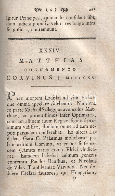 Horányi, [Elek] Alexius: De Sacra Corona Hungariae et Regibus eadem redimitis Commentarius. [Pest] Pestini, 1790. Typis Trattnerianis. 378 p. Egyetlen kiadás. II. Lipót 1790. január 28-án kelt császári rendeletével a Szent Korona visszakerült Magyarországra. A nemzeti ereklye visszakerülésének alkalmából Horányi Elek (1736-1809), a nemzetközi hírű piarista szerzetes, történész alapos történeti művet írt a Szent Korona hagyománytörténetéről. E tanulmány állapította meg először, hogy a korona két részből áll, és részletesen adatolta a korona bizánci feliratának szövegét is. A nemzeti érzelmű történeti elbeszélés során a szerző többször is kiáll a magyar rendi alkotmány érvényessége mellett. A címoldalon és a belív több oldalán fametszetű könyvdísz. A címoldalon és verzóján régi gyűjteményi bélyegzések, az első előzéken régi katalógusszám. Poss.: gróf Karátsonyi Jenő könyvtára, gróf Klebelsberg Kuno Magyar Történetkutató Intézet. Aranyozott gerincű korabeli kartonkötésben. Jó példány.
