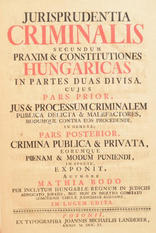 Description: [Bodó Mátyás (1690 - cca. 1750): büntetőjogi munkája]: Mathia Bodo: Jurisprudentia criminalis secundum praxim et constitutiones Hungaricas in duas partes divisa [...] Posonii (Pozsony), 1751, Joannis Michaelis Landerer, (20)+325+(15) p. Latin nyelven. Kissé sérült korabeli, aranyozott gerincű egészbőr kötésben,