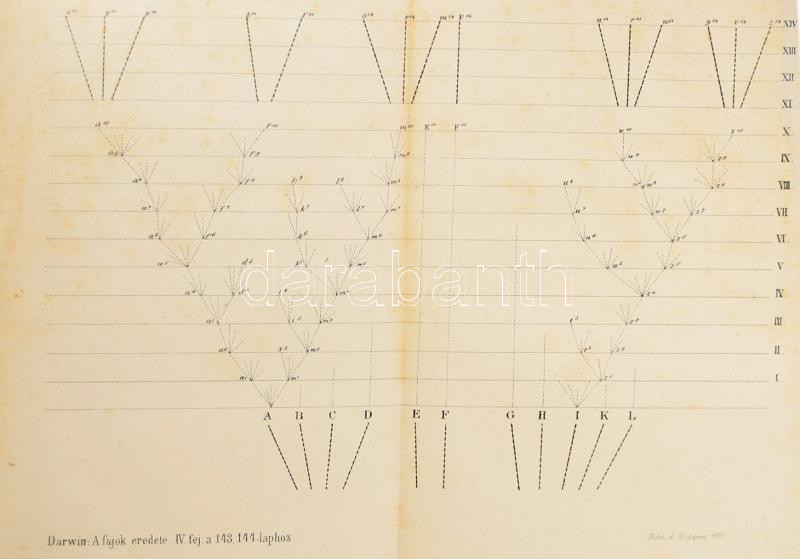 Darwin, Charles: A fajok eredete a természeti kiválás útján vagyis az előnyös válfajok fenmaradása a létérti küzdelemben. Az eredeti hatodik bővitett s javitott kiadása után fordította Dapsy László. Revideálta Margó Tivadar. I-II. kötet. Bp., 1873-1874., Kir. Magyar Természettudományi Társulat, XVI+(2)+303 p.+1 (kihajtható ábrával) t.; 1 t.+VII+361+3 p. Első magyar kiadás. Korabeli aranyozott gerincű egészvászon-kötés, "Bóka László könyvkötő Pesten", kopott, foltos borítóval, a gerincen címkékkel, az I. kötet gerincén kis sérüléssel, és az I. kötet hátsó táblája kissé vetemedett, néhány kissé foltos lappal. Ritka!