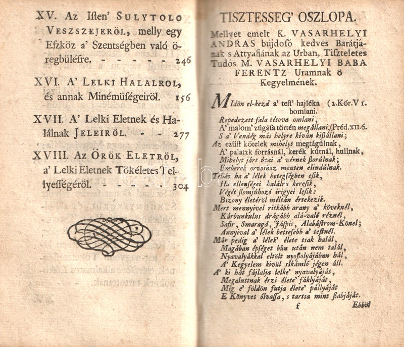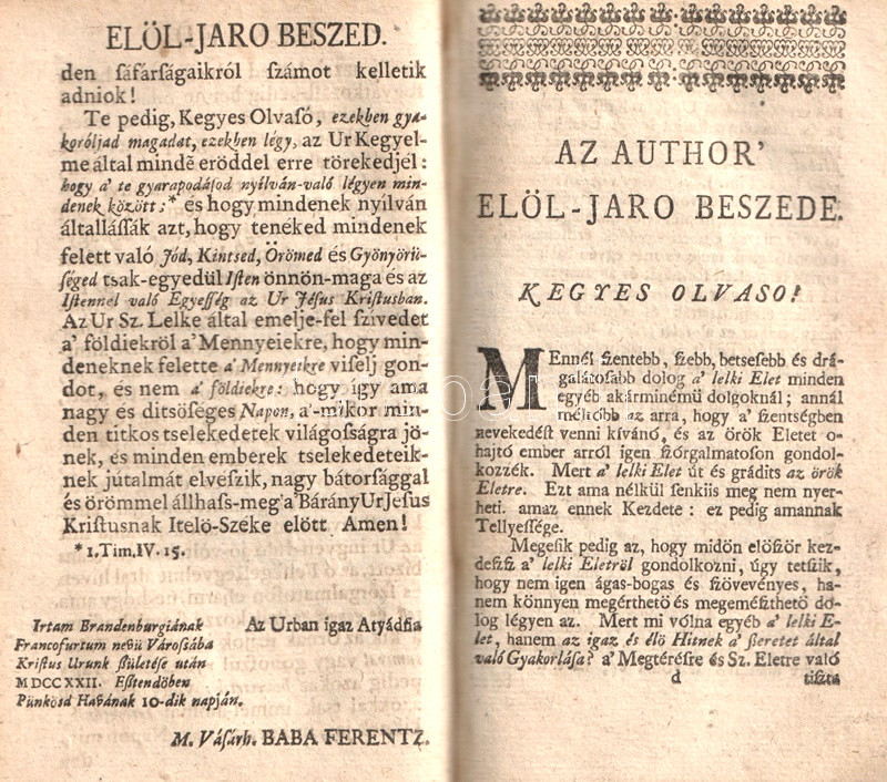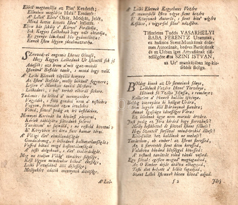 Campegius Vitringa: Lelki elet. Az-az: Az Ur Jésus Kristusban igaz Hit által béóltatott és ö benne élö Embernek lelki allapatjának rövid leírása. [A fordító barátjának egykori példánya.] Mellyet az eklesiának közönséges hasznára nem régen deák nyelven botsátott-ki idősbik Campegius Vitringa, [...] Mostan pedig a' Magyar Eklesiákban az együgyüeknek hasznokra a magyar nyelvre fordított M[aros] V[ásárhelyi] B[aba] F[erenc]. Nyomtattatott Francofurtumban, 1722. Schwartz János által. [88] + 341 + [3] p. Egyetlen kiadás. Campegius Vitringa (1659-1722) holland protestáns teológus és hebraista volt. A fordító, Baba Ferenc nagyenyedi tanulmányai után 1717-ben iratkozott be az Odera-Frankfurti egyetemre, ahol 1722-ig tanult. Visszatérése után Kolozsvárott élt és tokaji borral kereskedett, de vállalkozásába végül belebukott és eladósodott. Elmebetegen halt meg 1740-ben, Pápán. Krizbai Deső Mihály példányunk egykori tulajdonosa a fordító diáktársa és barátja volt. Tiszteletére 10 strófás magyar rímes verset írt a kötethez, amely annak bevezetőjében, az üdvözlő versek között jelent meg. Poss.: Michaelis D. Krizbai [Krizbai Deső Mihály református lelkész, Előbb hazájában tanult, majd 1720. május 21-től Odera-Frankfurtban, 1723-tól Utrechtben tanult. Hazatérve gróf Teleki József udvari papjaként szolgált.] A XIX. század közepén készült, gerincén kopott aranyozású félvászon kötésben. Nagyon jó példány.