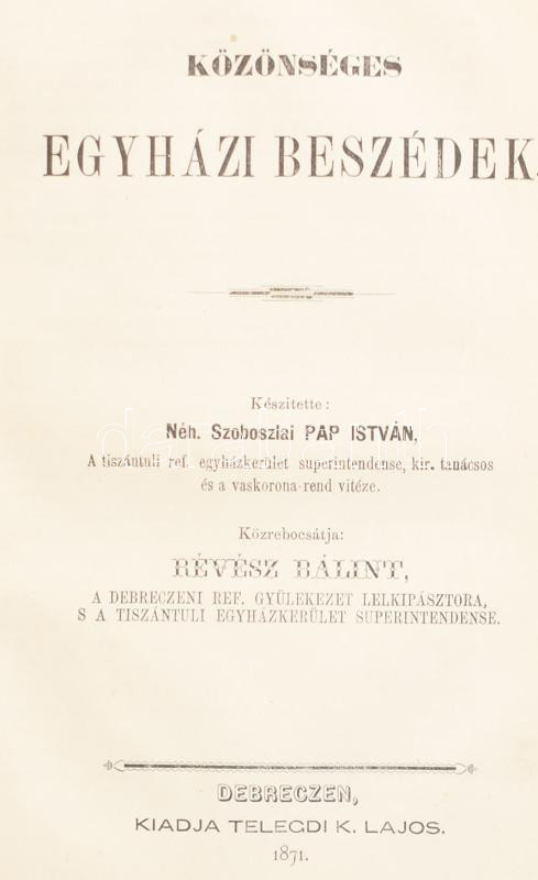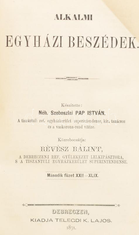 Hozzá tartozik: Szoboszlai Pap István: Alkalmi egyházi beszédek. I-II. füzet. [Egyekötve.] Első füzet I-XXI. Közrebocsátja: Révész Bálint. Debrecen, 1871, Telegdi K. Lajos, 4+1-224+2+225-494+4 p. Korabeli aranyozott, vakonyomásos egészbőrkötés, kopott borítóval, a gerincen kis sérüléssel.