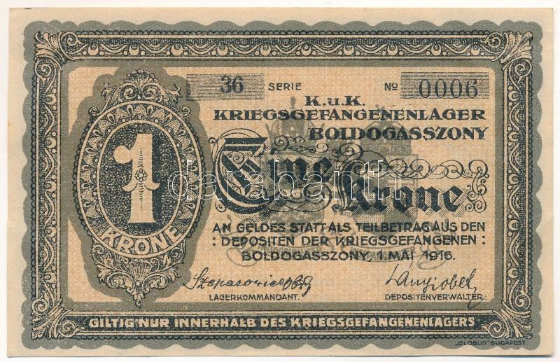 Description: Boldogasszony / Hadifogolytábor 1916. május 1. 1K arab sorozat- és sorszámmal, alacsony "36 0006" sorszámmal T:AU,XF / Hungary / Boldogasszony / POW camp 05.01.1916. 1 Krone with arabic serial number and low "36 0006" number C:AU,XF Adamo HHB-1.3