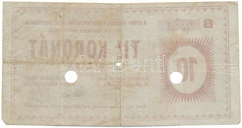 Győr 1919. 10K "Győri Általános Takarékpénztár" két lyukaszt... https://www.darabanth.com/en/44-Major-auction/44.1/Numismatics/Emergency-Coins-and-Notes~18182/Gyor-1919-10K-3Cem3EGyori-Altalanos-Takarekpenztar3Cem3E-ket-lyukasztassal-ervenytelenit~II3344863