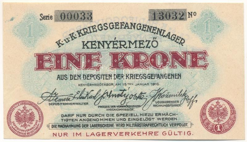 Description: Kenyérmező / Hadifogolytábor 1916. január 15. 1K arab sorozat- és sorszámmal "00033 13032" T:UNC,AU Hungary / Kenyérmező / POW Camp 15.01.1916. 1 Krone with arabic series and serial number "00033 13032" C:UNC,AU
