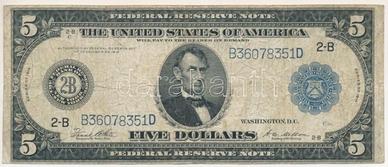 Amerikai Egyesült Államok 1921-1928. (1914) 5$ "B36078351D" ... https://www.darabanth.com/en/44-Major-auction/44.1/Numismatics/Worldwide-banknotes~17957/Amerikai-Egyesult-Allamok-1921-1928-1914-5USD-B36078351D-Federal-Reserve-Note-nagymeretu-k~II3334501