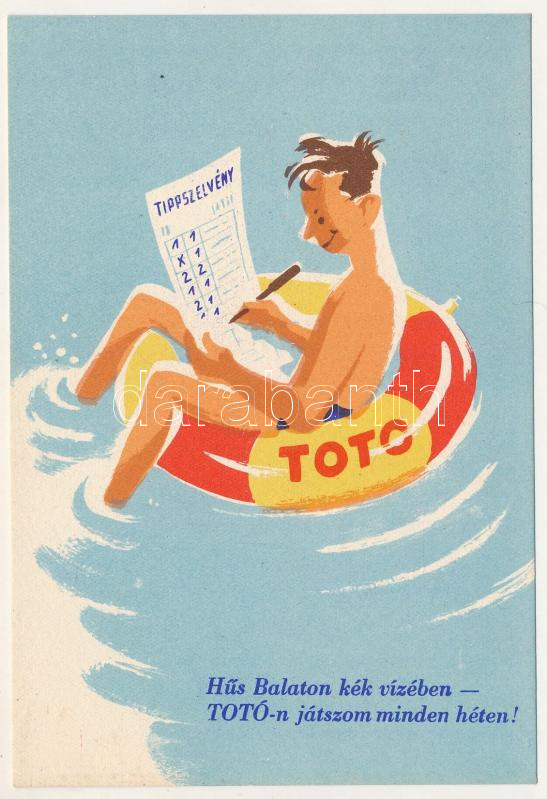 Hűs Balaton kék vízében - TOTÓ-n játszom minden héten! Totó tippszelvény reklám / Hungarian lottery ticket advertisement card