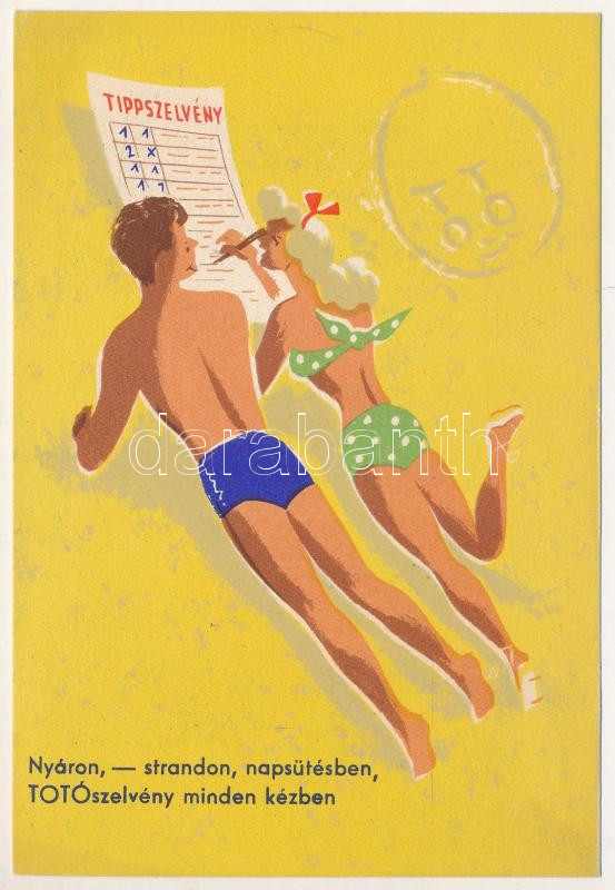 Nyáron, strandon, napsütésben, TOTÓszelvény minden kézben! Totó tippszelvény reklám / Hungarian lottery ticket advertisement card (EK)