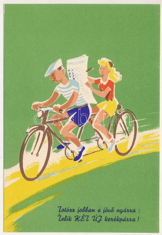 Totózz jobban a jövő nyárra: telik két új kerékpárra! Totó tippszelvény reklám / Hungarian lottery ticket advertisement card