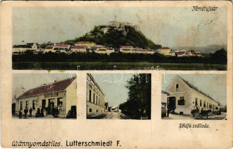 Németújvár, Güssing; vár, utcakép, Zöldfa szálloda, Lutterschmiedt Ferenc üzlete és saját kiadása / castle, street, hotel, shop (fl)