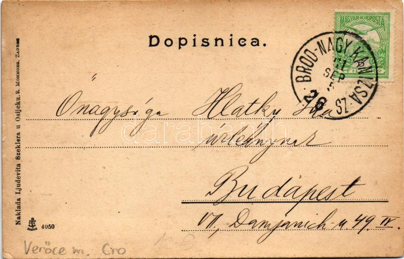 Description: 1911 Eszék, Essegg, Osijek; Duga ulica sa crkvom sv. Roka. Ljudevita Szeklera / Lange Gasse mit der Kirche des hl. Rochus / Hosszú utca és Szent Rókus templom / street, church + "BROD - NAGY-KANIZSA 26. SZ." vasúti mozgóposta bélyegző (r)
