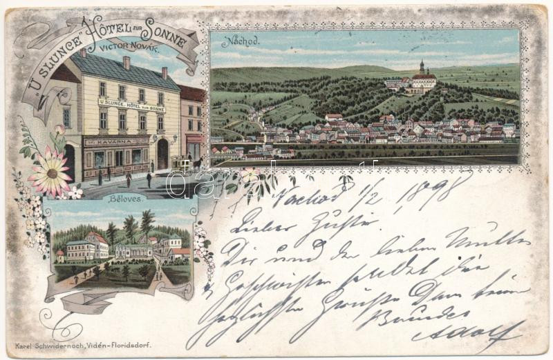 Description: 1898 (Vorläufer) Náchod, Beloves, U Slunce Hotel zur Sonne Victor Novák, Kavárna / general view, hotel and café. Karel Schwidernoch Art Nouveau, floral, litho (kopott sarkak / worn corners)