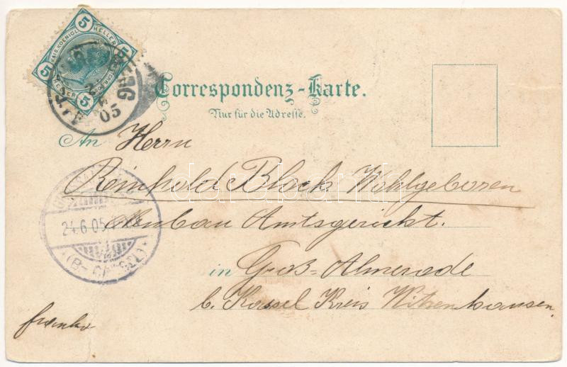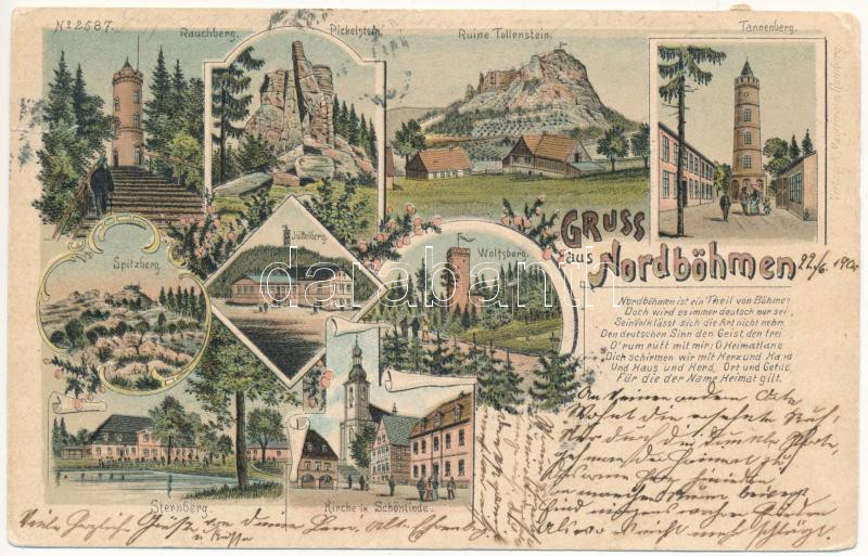 1905 Nordböhmen, Severní Cechy; Rauchberg, Pickelstein, Ruine Tollenstein, Tannenberg, Spitzberg, Jüttelberg, Wolfsberg, Sternberg, Kirche in Schönlinde / lookout towers, rocks, castle ruins, towers, church. Verlag R. Mauermenn No. 2587. Art Nouveau litho (szakadás / tear)