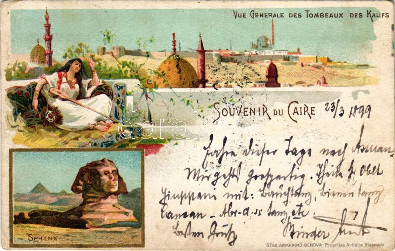 Description: 1899 (Vorläufer) Cairo, Le Caire; Vue Generale des Tombeaux des Kalifs, Sphinx. Stab. Armanino (Genova) / tombs, mosque, sphinx, folklore. Art Nouveau, litho (EK)