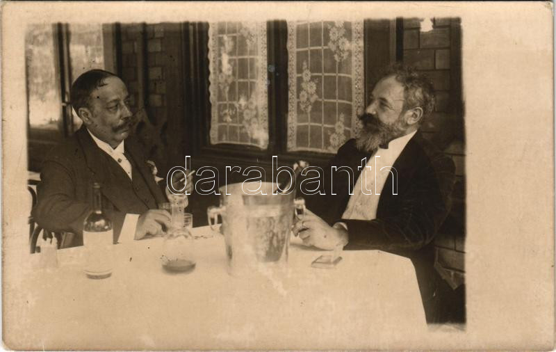 1912 Budapest XIV. Gundel étterem terasza, Felpéczi Ihász Aladár (1856-1919) újságíró, költő, ügyvéd, író, szövegíró, lapszerkesztő és Feszty Árpád (1856-1914) festőművész. Hátoldalon Ihász "Hulló levelek" verse Holló Lajosnének (Iszer Sarolta) címezve Kiskunfélegyházára - photo