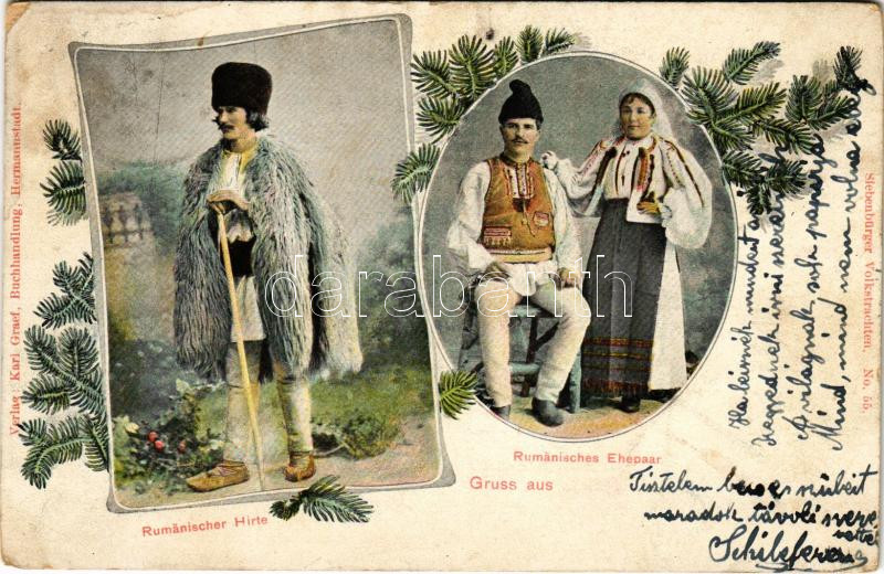 1905 Rumänischer Hirte, Rumänisches Ehepaar. Siebenbürger Volkstrachten No. 55. Verlag Karl Graef (Hermannstadt) / Romanian folklore from Transylvania. Art Nouveau, floral (EK)