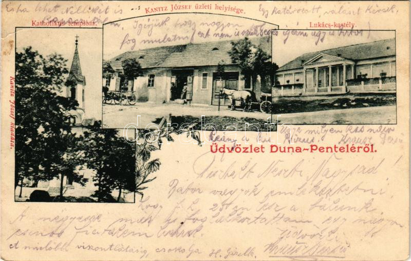 1902 Dunaújváros, Dunapentele, Sztálinváros; katolikus templom, Lukács kastély, Kanitz József üzlete és saját kiadása (EB)