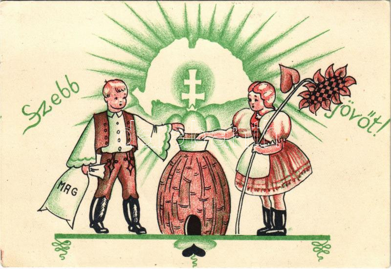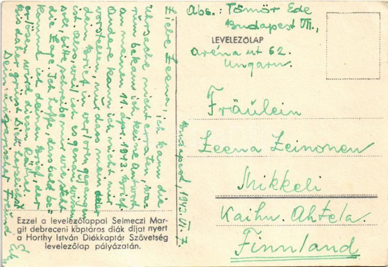 Description: 1943 Szebb jövőt! Ezzel a levelezőlappal Selmeczi Margit debreceni kaptáros diák díjat nyert a Horthy István Diákkaptár Szövetség levelezőlap pályázatán / Hungarian Youth Association irredenta propaganda s: Selmeczi Margit (EK)