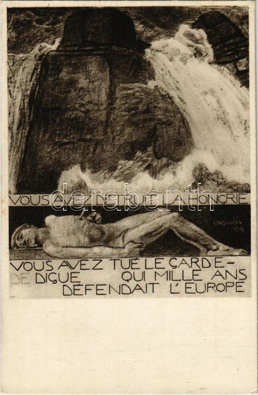 Description: Magyarország földarabolása ciklus III. képe: "Megöltétek a magyar gátőrt, aki ezer évig védte Európát" Kiadja Magyarország Területi Épségének Védelmi Ligája / Dismemberment of Hungary. "You have killed Hungary and destroyed the dikes which defended Europe for a thousand years" Hungarian irredenta propaganda, Trianon s: Unghváry Sándor