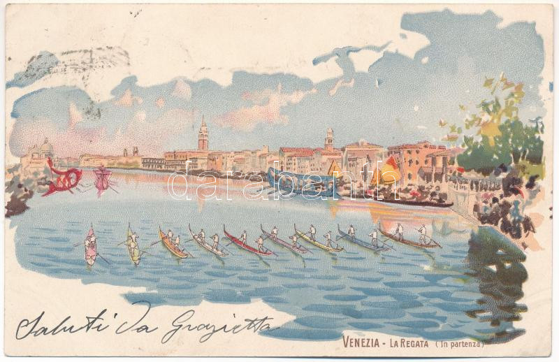 Venezia, Venice; La regata (In partenza) / The Historic Regatta start. F. Guggua litho (Rb)