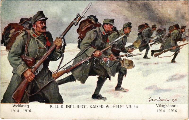 1916 Weltkrieg 1914-1916 - K.u.K. Inft.-Regt. Kaiser Wilhelm Nr. 34. Verlag K.u.K. Kmdo. der 27. Inf. Trp. Dion. / A tiszta jövedelem a Kárpátokban elpusztÃtott falvak újjáépÃtésére és a második hadsereg legénységi özvegyei és árvái alapÃtványára fordÃttatik / WWI Austro-Hungarian military art postcard, support fund s: Hans Larwin (kopott élek / worn edges)