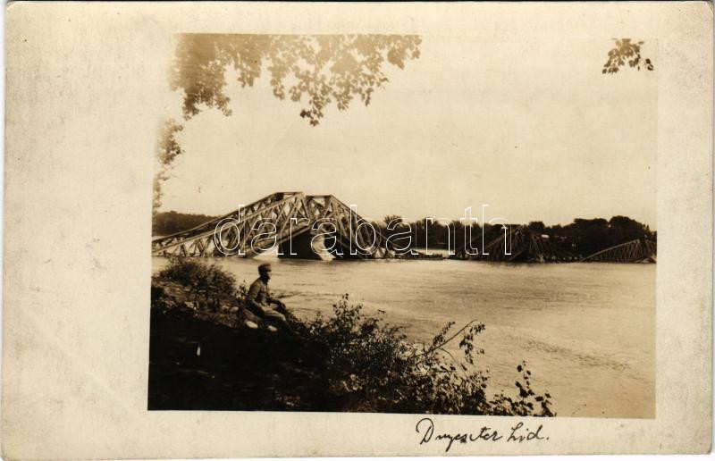 Első világháború, lerombolt híd a Dnyeszter folyón, katona / WWI K.u.k. military, demolished bridge on the river Dniester. photo (vágott / cut)