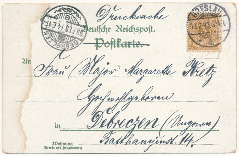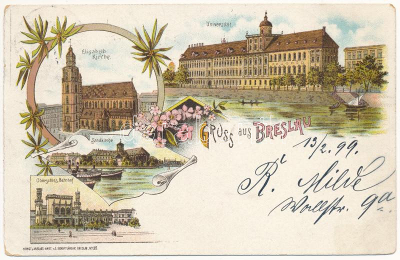 1899 (Vorläufer) Wroclaw, Breslau; Universitat, Elisabeth Kirche, Sandkirche, Oberschles. Bahnhof / university, churches, railway station. S. Schottländer Art Nouveau, floral, litho (fl)
