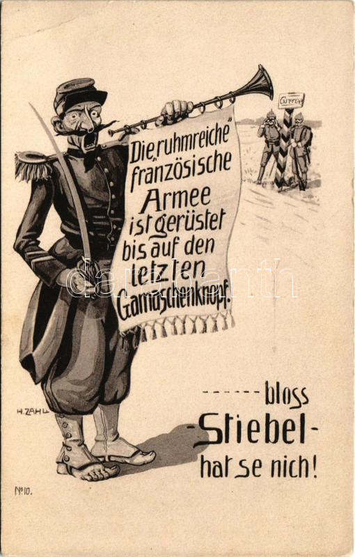 Description: Die ruhmreiche französische Armee ist gerüstet bis auf den letzten Gamaschenknopf - bloss Stiebel hat se nich! / WWI German military, anti-French mocking propaganda art postcard s: H. Zahl (EB)