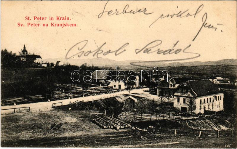 1916 Pivka, St. Petra na Krasu, San Pietro del Carso, St. Peter in Krain; general view, wood cutting, Hotel St. Peter, lumber yard, church. B.K.S.W.