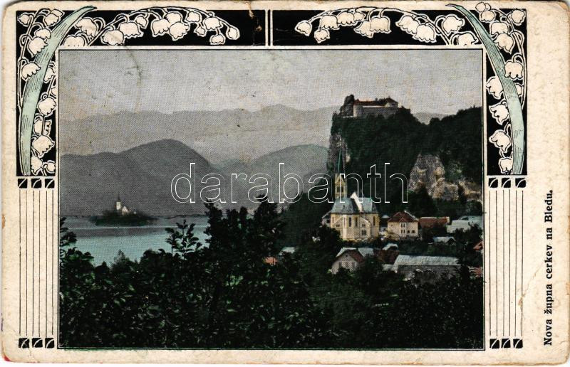 1917 Bled, Veldes; Nova zupna cerkev na Bledu / church, lake, castle. Art Nouveau floral (b)