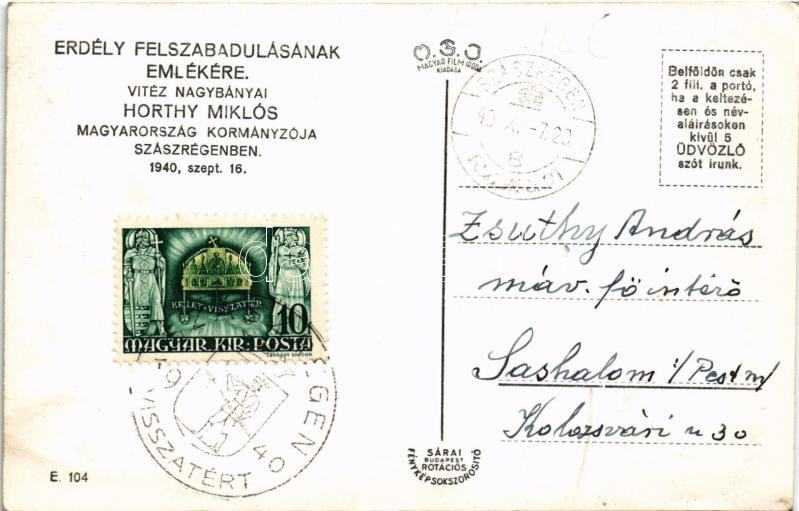 Description: 1940 Szászrégen, Sächsisch-Regen, Reghin; bevonulás, Vitéz Nagybányai Horthy Miklós Magyarország kormányzója és Purgly Magdolna / entry of the Hungarian troops, Regent Horthy and his wife + "1940 Szászrégen visszatért" So. Stpl. (fl)